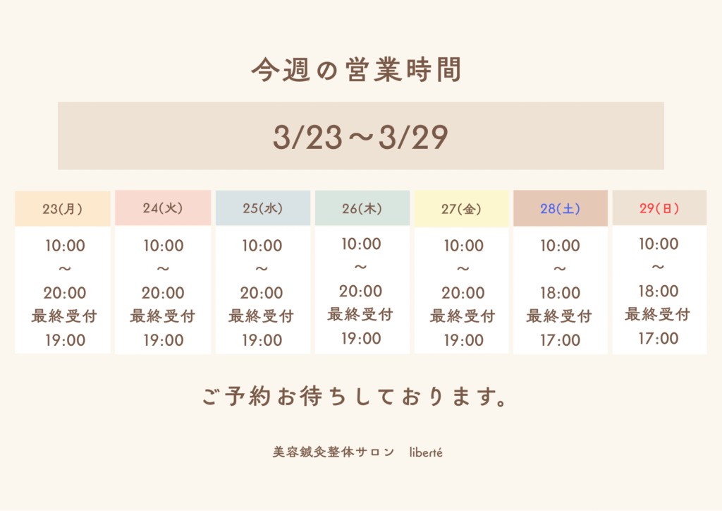 3/23~週間営業予定のお知らせ 2026 3/21 当院からのお知らせ 2026年3月21日こんにちは!lliberte です。3月も終わりが近づき、新生活の準備をされている方も多いのではないでしょうか。お子さまの入学式や、ご自身の入社式・新しいスタートの前に、ぜひお肌やお身体を整えにいらしてくださいね。 当院からのお知らせ よかったらシェアしてね! URLをコピーしました! URLをコピーしました! 明日21(土)の空き状況のお知らせです この記事を書いた人 liberte-2025-0123 関連記事 明日21(土)の空き状況のお知らせです 2026年3月20日 明日,明後日の空き状況のお知らせです 2026年3月13日 明日の空き状況のお知らせ 2026年3月1日 2/23~週間営業予定のお知らせ 2026年2月21日 2/16~週間営業予定のお知らせ 2026年2月13日 本日の空き状況のお知らせ 2026年2月8日 2/9~週間営業予定のお知らせ 2026年2月6日 「ビビビ祭」始まりました!! 2026年2月2日